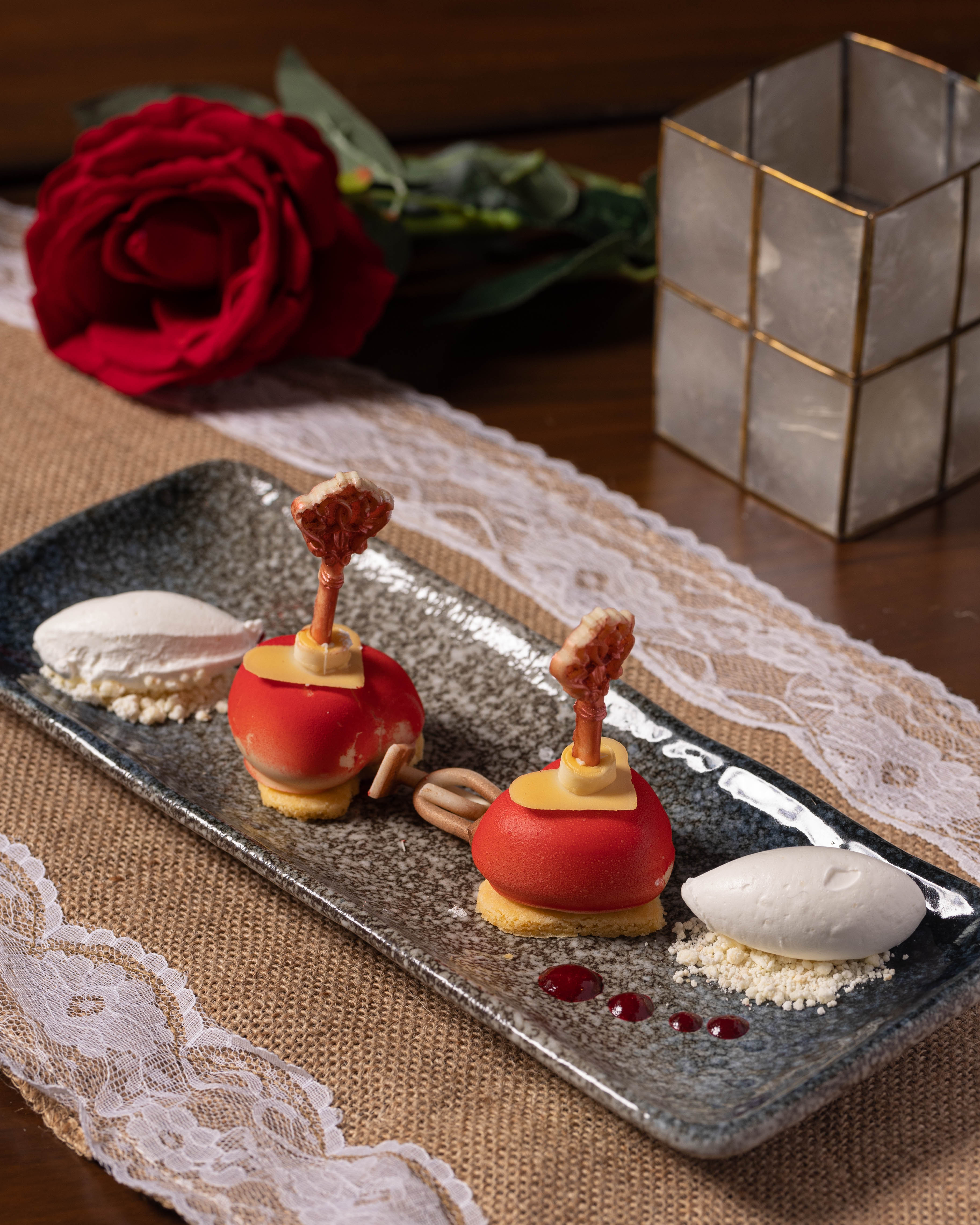 夜晚在以下场景中落下帷幕: 希马加斯, a 马尼拉之心 覆盆子与玫瑰的邂逅,融合慕斯、紫薯、杏仁与布列塔尼酥饼。这款专为共享设计的甜点,散发着静谧的甘甜余韵,恰似爱情沉淀为永恒的珍藏。